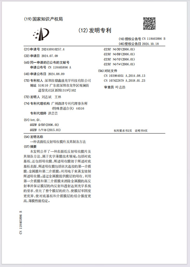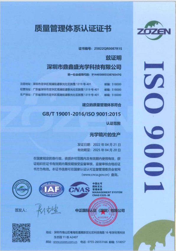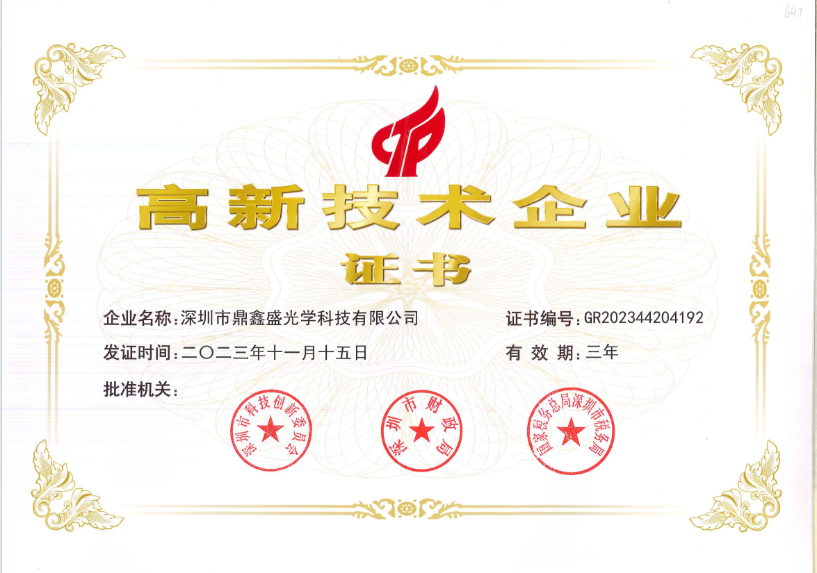 深圳市鼎鑫盛光學科技有限公司2008年成立於東莞市鳳崗鎮,2010年因市場需求搬至深圳市觀瀾街道,是一家專業從事光學鏡片研發、生產、銷售為一體的國家高新和深圳市高新技術企業。公司擁有強大的研發團隊、技能嫻熟的製造團隊、專業的檢測團隊。